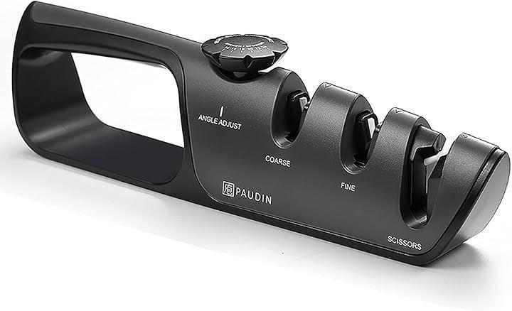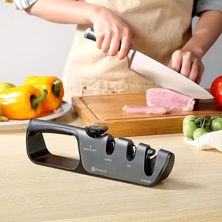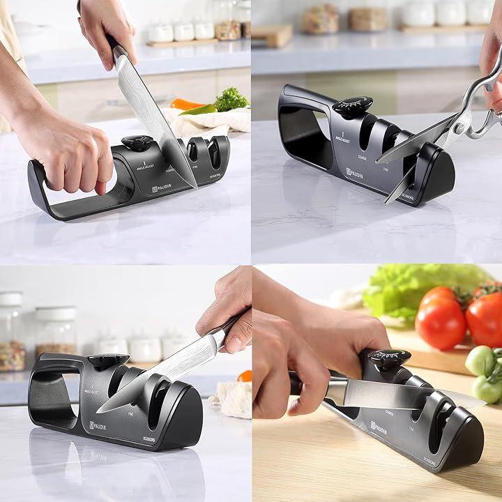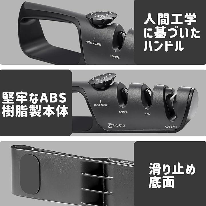 「プロ仕様の多機能シャープナー」 滑り止めゴム底+非接触刃ガード設計で、女性や高齢者でも安全に操作可能。