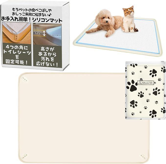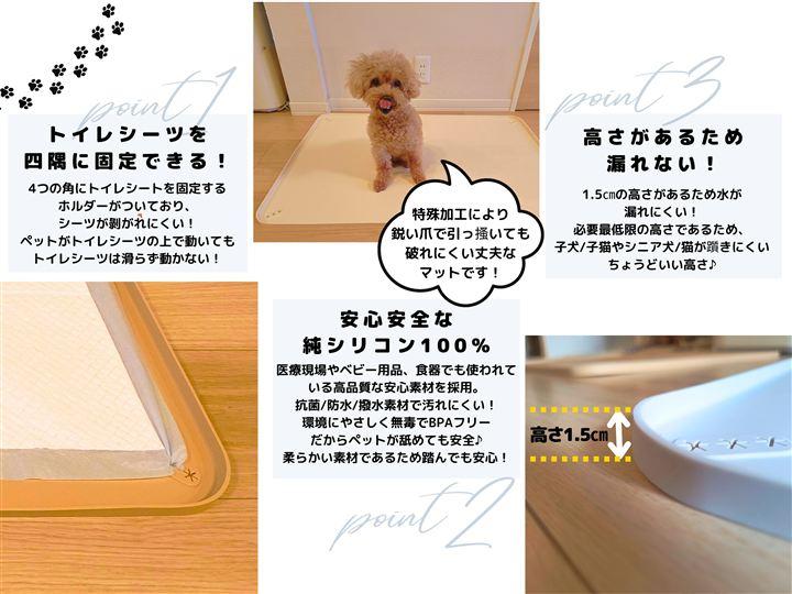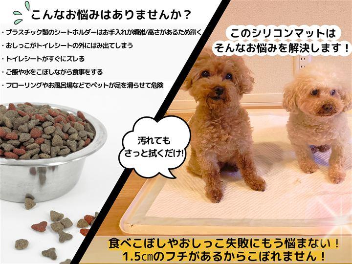 このようなお悩みはありませんか? ・おしっこがトイレシートの外にはみ出る ・トイレシートがすぐにズレる ・プラスチック製のシートホルダーはお手入れが煩雑/高さがあるため躓く ・ご飯や水をこぼしながら食事をする ・フローリングやお風呂場などで滑ってしまう シリコンマットはそんなお悩みを解決します。 食べこぼしやおしっこ失敗にもう悩まない。 1.5cmのフチがあるためこぼれません。汚れてもさっと拭くだけ。 たくさんのお客様に選ばれています。 シリコンマットが選ばれる5つの理由 ポイント(1)トイレシーツを四隅に固定可能。 4つの角にトイレシートを固定するホルダーがついているため、シーツが剝がれにくい。ホルダーに固定しなくてもトイレシートがズレにくいよう設計しています。