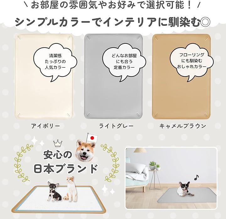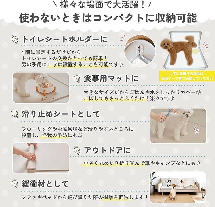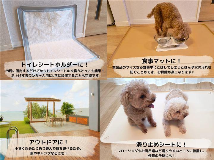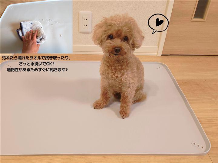 シリコンマットは裏表ともに滑りにくい素材を採用しており、トイレシートや食器がズレにくい。足上げするワンちゃん用にL字にして壁際に設置することも可能です。