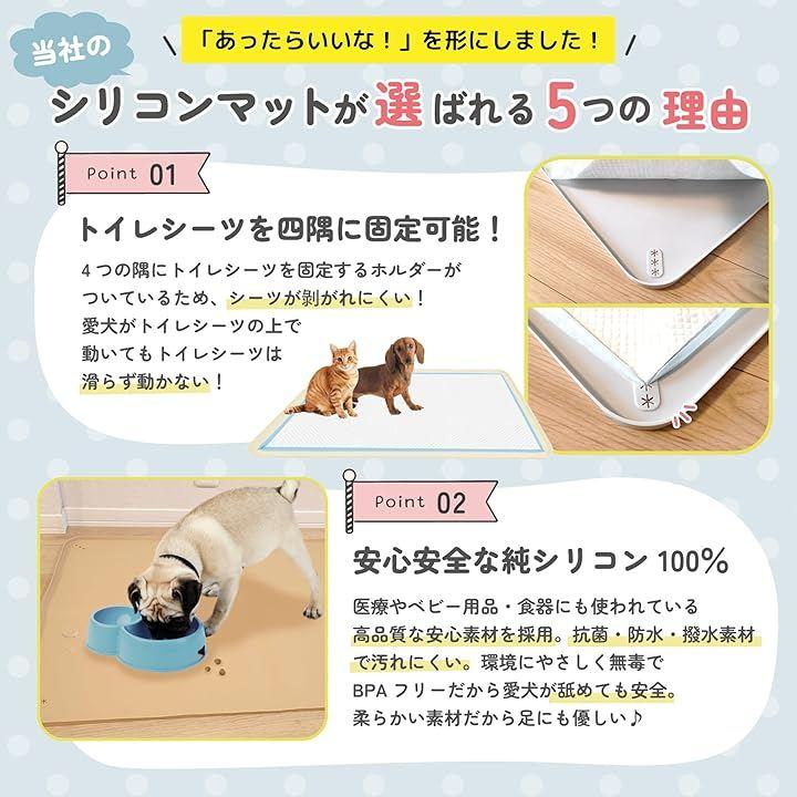 愛犬がトイレシーツの上で動いてもトイレシーツは滑らず動かない。 ポイント(2)安心安全な純シリコン100% 医療現場やベビー用品、食器でも使われている高品質な安心素材を採用。