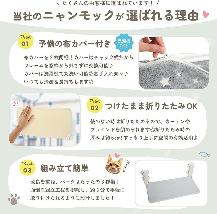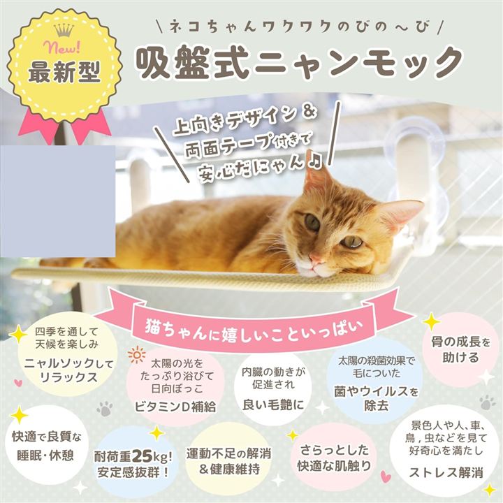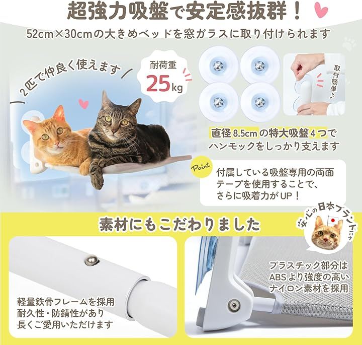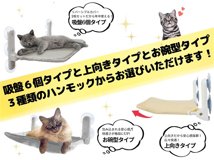 「お客様の声を元にグレードアップ。」猫ちゃんが安心してのびのびとくつろげるよう、ハンモックの端を上向きに改良しました。また、吸盤専用の強力な両面テープ9個が付属しており、さらに安定感・安心感がアップしました。
