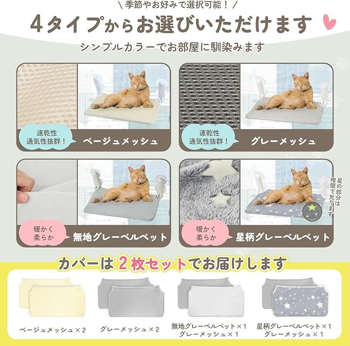 速乾性のあるメッシュ生地と暖かく柔らかい肌触りのベルベット生地の2種類があり、季節やお部屋の雰囲気、愛猫の好みに合わせて2枚お選びいただけます。
