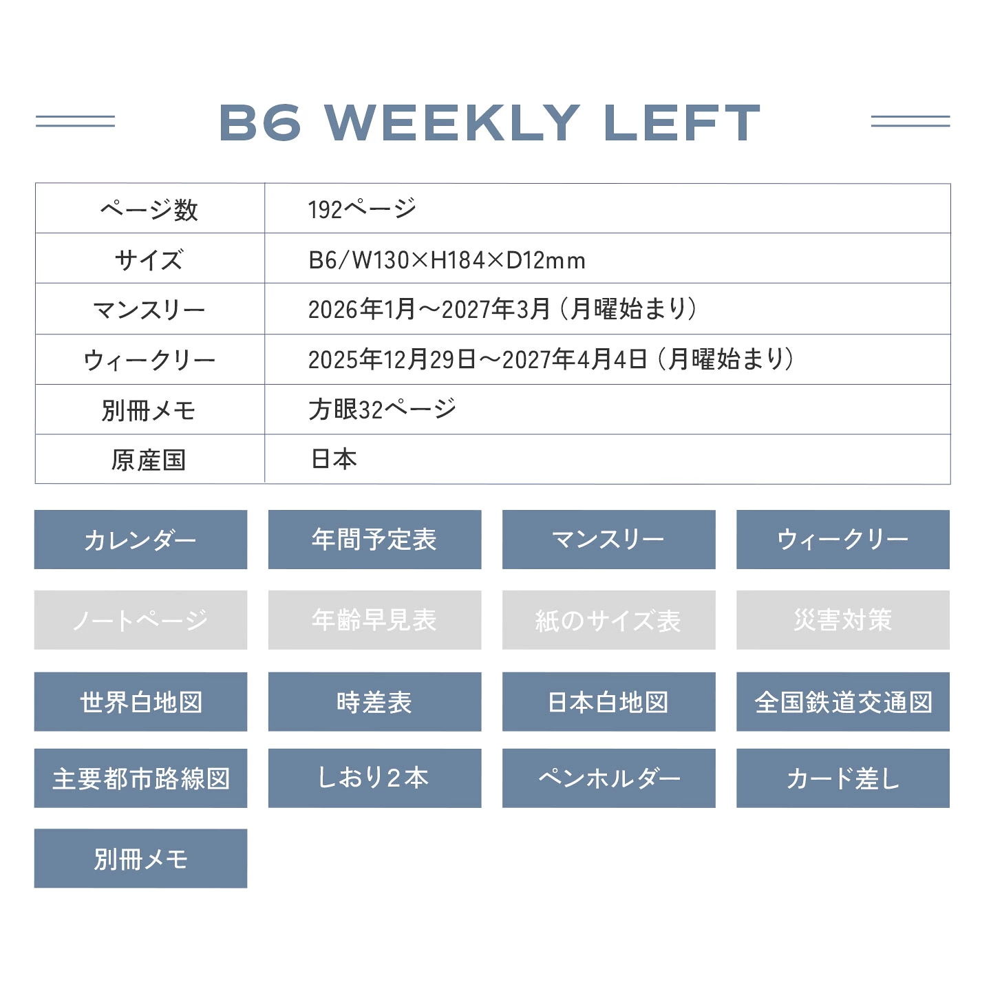 【2026年1月始まり ウィークリー・レフト手帳 ランディ】本体生地とは異なる華奢なベルトを組み合わせた、上品な印象のウィークリ手帳。ビジネスなどシーンを問わず使えるシンプルなデザインです。