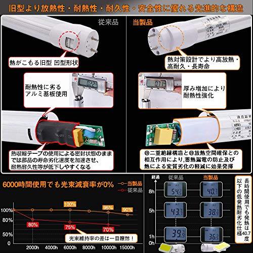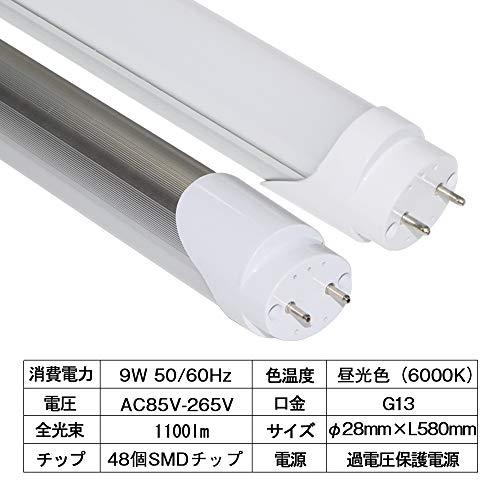 消費電力:9W(20W相当) 高輝度SMDチップ搭載 全光束:1100LM, 従来の1100LM 10WLED蛍光灯に比べ、同じ明るさでもより11%電気代削減達成 電圧 AC85V-265V 口金G13 T8型 T5非対応 長さ58cm 両側給電(片ピン・両ピン)接続方式