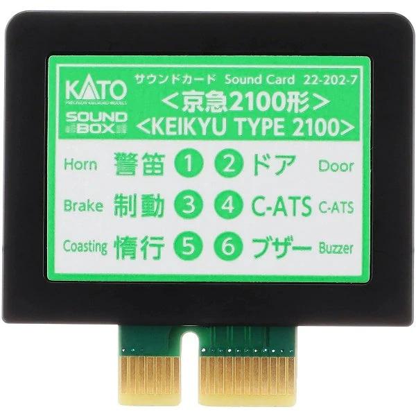 KATO Nゲージ サウンドカード 京浜急行 2100形 22-202-7 鉄道模型用品 当カードは「サウンド同調」タイプ。車両の走行 (加速や減速)がサウンド再生にマッチするように自動的に調節。パワーパックのコントローラーを急激に操作しても、あたかも実車を運転しているかのように、速度は滑らかに変化します。カード認識時 (イジェクトボタン押下時)は、イジェクトランプ点灯と共にパンタグラフ上昇音が鳴ります。モーター音、転動音、コンプレッサー音は、走行時の状況により自動的に鳴動します。 ドレミファインバータ音は車両の発車と同時に鳴り響きます。ファンクションボタン (1~6)を押すと、以下が楽しめます。1.警笛 (電笛/電笛+空笛を選択可能) 2.ドアの開閉音 3.制動緩解音 4.C-ATSベル音5.惰行 (走行中)・停車位置修正機能 (停車中) 6.車内ブザー音サウンドカード〈E233系〉と同様に、電車の加速・減速に伴うモーター音 (制御音)をリアルに楽しめるよう、当カードをサウンドボックス本体スロットに挿入して使用する場合、パワーパックのコントローラーの操作に対する車両の走行が、一般的な反応とは異なります。尚、「緊急停車機能」がサウンドボックス本体にインストールされます (走行中のイジェクトボタン押下で即時停車)。