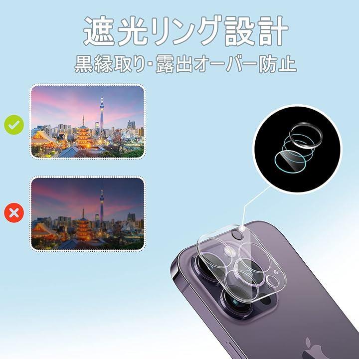 「露出過度防止。カメラを保護」 iphone14pro カメラ保護カバー 上の独自の露出防止リング、撮影時の露出オーバーを効果的に防止し、高画質な画像が得られます。撮影時に影響をおよぼさない透明度の高い保護フィルムです。