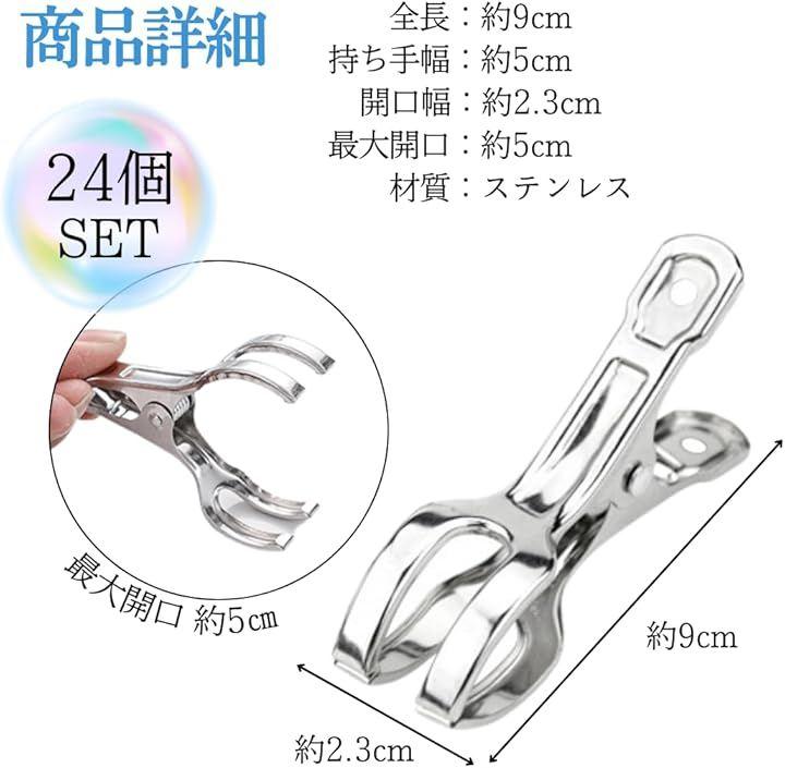 「商品内容」本体12個 / 24個セット 「サイズ」全長:約9cm 持ち手幅:約5cm 開口幅:約2.3cm 最大開口:約5cm 「重量」約13g 「材質」ステンレス