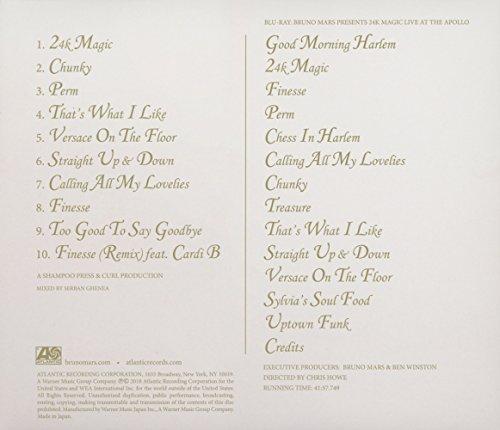 通常1-5営業日で発送:内容紹介 本物の輝きが音楽の奇跡を起こす夜―。祝・グラミー賞7冠! 本物(24K)の輝きが音楽の奇跡(MAGIC)を起こす夜―。遂に頂点を極めた“音楽界の至宝"ブルーノ・マーズ。グラミー賞6冠に輝く歴史的傑作に超豪華版が登場! ★来日公演を記念し日本のみ先行発売される超豪華CD+Blu-Ray商品! ★【CD+Blu-Ray】【日本独占先行発売】●最新ヒット「フィネス(リミックスfeat.カーディー・B)」追加収録! ●217年9月に行われたNYアポロシアターでのスペシャル・ライヴを収録したBlu-Ray付!▼収録内容(Disc 1)1. 24K・マジック 2. チャンキー 3. パーマ 4. ザッツ・ホワット・アイ・ライク 5. ヴェルサーチ・オン・ザ・フロア 6. ストレイト・アップ・アンド・ダウン 7. コ-リング・オール・マイ・ラヴリーズ 8. フィネス 9. トゥー・グッド・トゥ・セイ・グッバイ(さよならは言えなくて) 1*. フィネス(リミックス) feat.カーディ・B * Bonus Track(Disc 2) BLU-RAY: BRUNO MARS P
