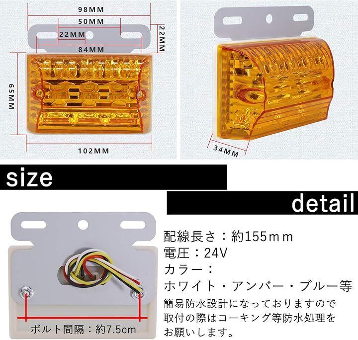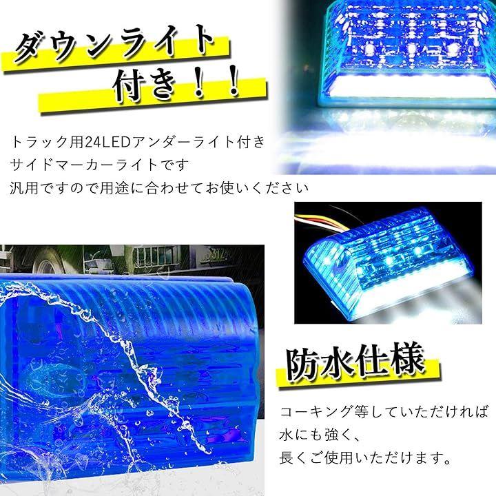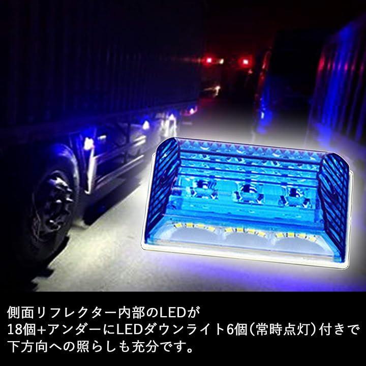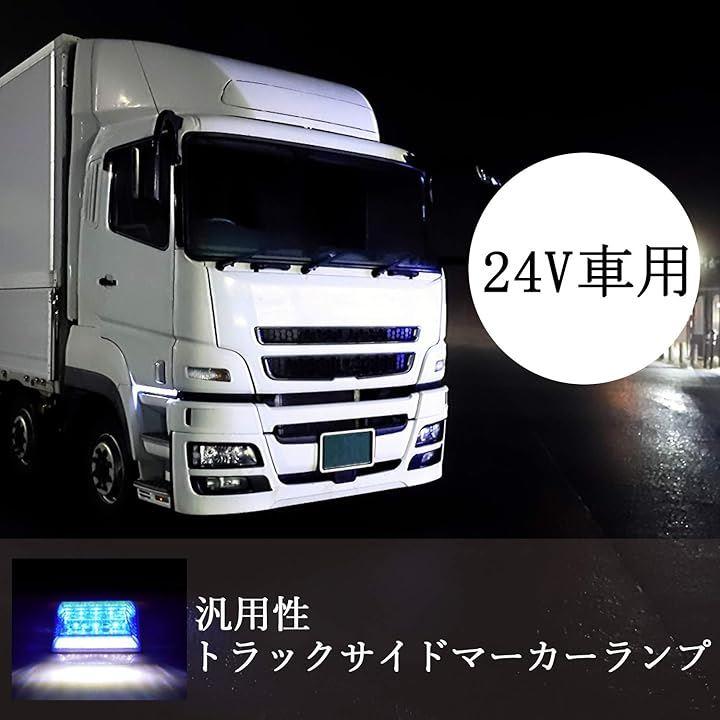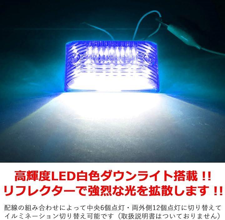 24V車用の汎用サイドマーカーランプであり、配線の組み合わせによって中央6個点灯・両外側12個点灯のイルミネーション切り替えが可能です。