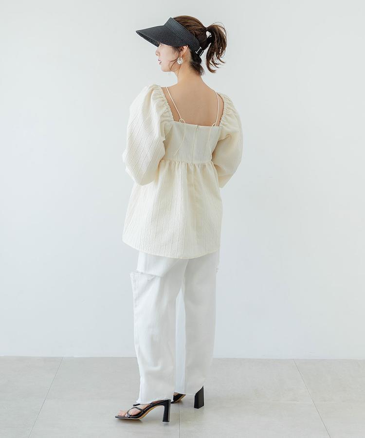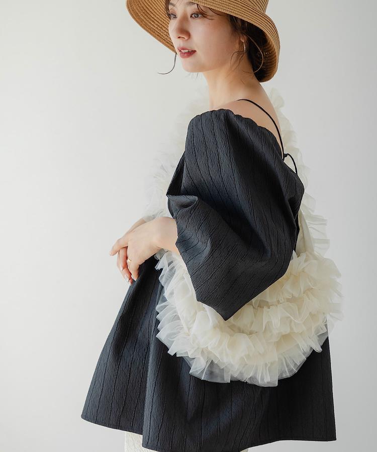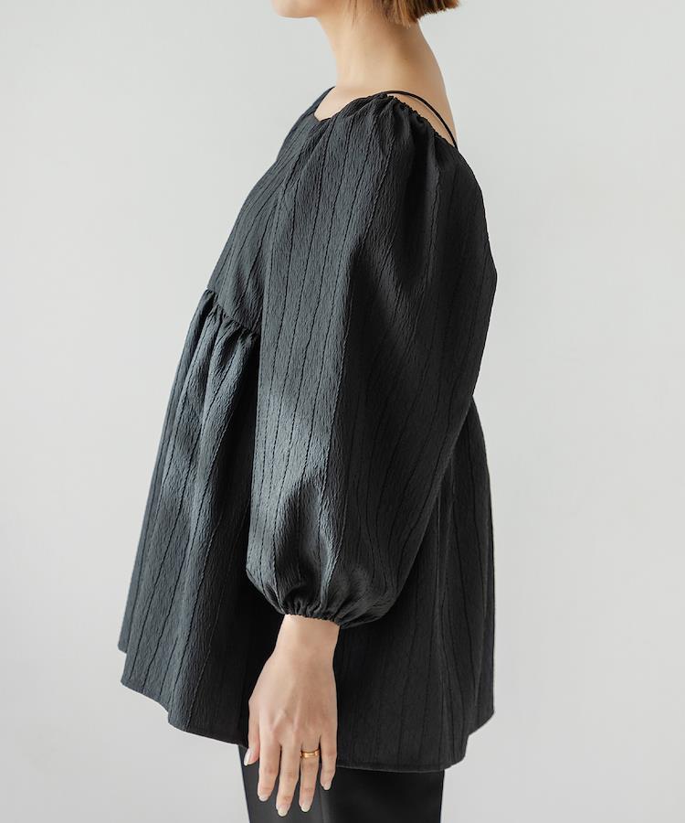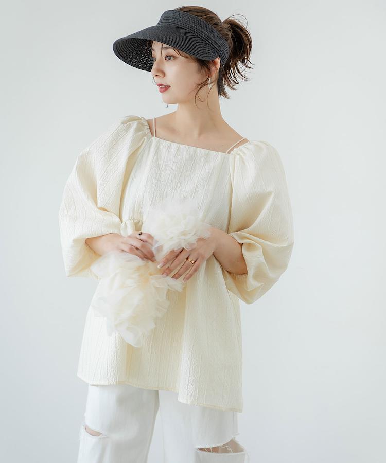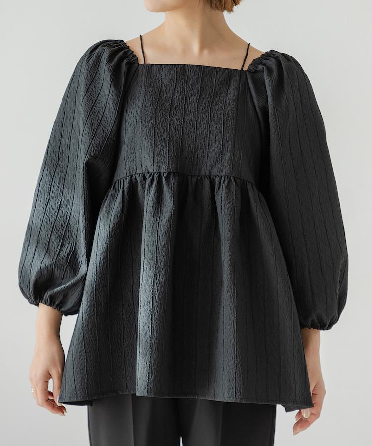 オフショル&スクエアネック2WAYデザインのチュニックブラウス【ディティール】着るだけでふわっと広がるフレアシルエットが魅力のブラウスヒップが隠れる丈感なので、気になる体型カバー効果も◎袖口がゴム仕様になっているので、少し上げるとボリューム感たっぷりのお袖になります。デコルテラインをきれいに見せてくれるスクエアネックは大人女子にぴったり。しかもオフショルダーとしても着られる2WAYデザインなんです!袖山はギャザーゴムになっているのでオフショル時もしっかりフィット。華奢な細さが可愛いストラップがずり落ちを防止します。ストラップは自分で結べるので、身長・体型に合わせてご自身で長さ調節可能。バックファスナー付きで着脱もとってもラクチン。ディティールにこだわったスタッフにも大人気の1着です。【生地感】凹凸感のあるジャガード素材で高見え&上品な雰囲気に◎皺になりにくくイージーケアなのも嬉しいポイント。柔らかながら適度なハリ感でふんわりシルエットをキープしてくれます。**********************透け感:なし裏地:上見頃あり伸縮性:なし光沢感:なし生地の厚さ:普通**********************《生産国》中国