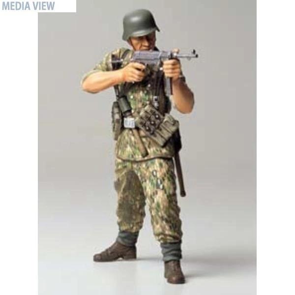 タミヤ 1/16 ワールドフィギュアシリーズ No.03 ドイツ陸軍 戦闘歩兵 迷彩野戦服 プラモデル 36303 第二次大戦後期の迷彩野戦服を着用したドイツ軍兵士のプラスチックモデル組み立てキットです。ストックを伸ばしたMP40短機関銃を射撃中の迫力あるポーズでリアルに再現。エンドウ豆パターンと呼ばれるM44型迷彩服の独特な塗装も楽しみながら腕を振るって頂けます。MP40をはじめとして、弾倉ケース、ガスマスクケース、手榴弾、スコップ、水筒、ヘルメットなどの装備品類も実感あふれる仕上がりです。人形1体入り。