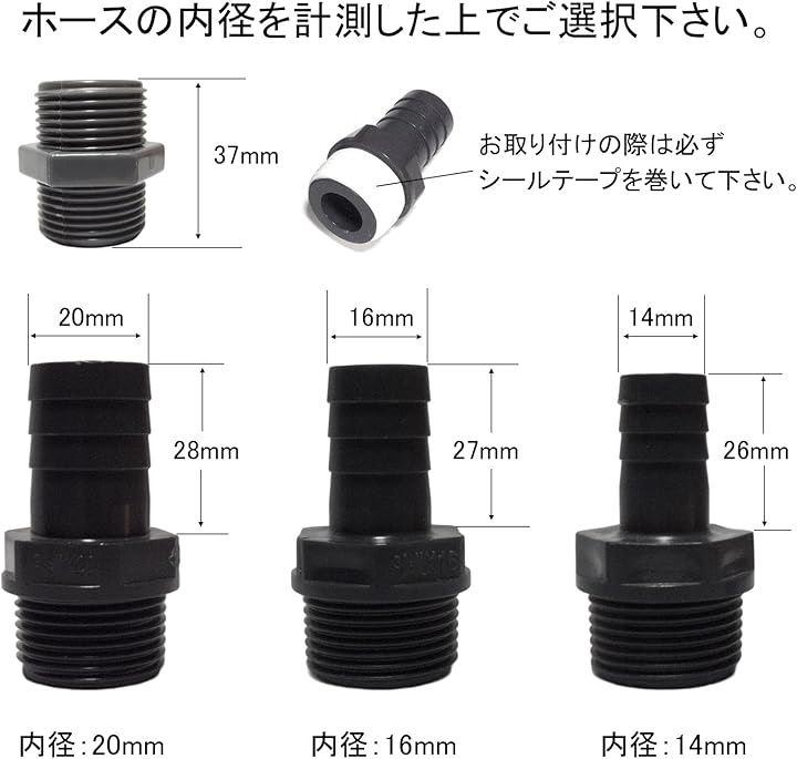 ネジの規格サイズは、3/4インチ(20A)、ホースニップルは3サイズ(14mm、16mm、20mm)ご用意致しました。