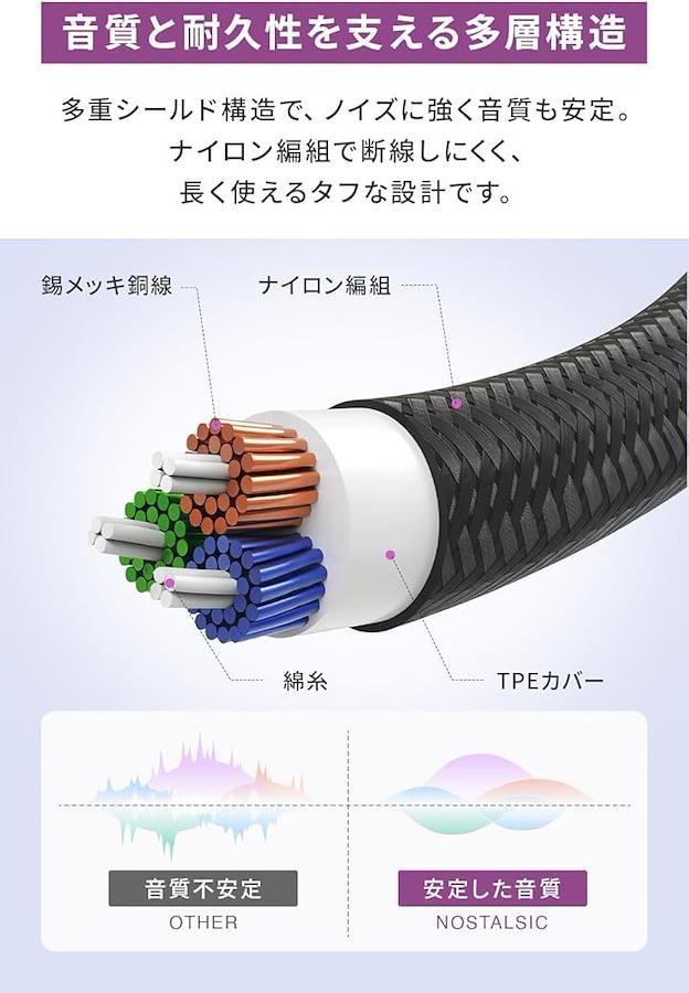 「高耐久構造で長く使える」ナイロン外装と強化プラグ構造により、繰り返しの抜き差しや折り曲げにも耐える設計。