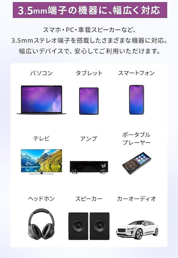 「幅広い3.5mm機器に対応」スマートフォン、PC、タブレット、ヘッドホン、カーオーディオ、スピーカーなど3.5mmステレオ端子を備えた機器で使用可能。