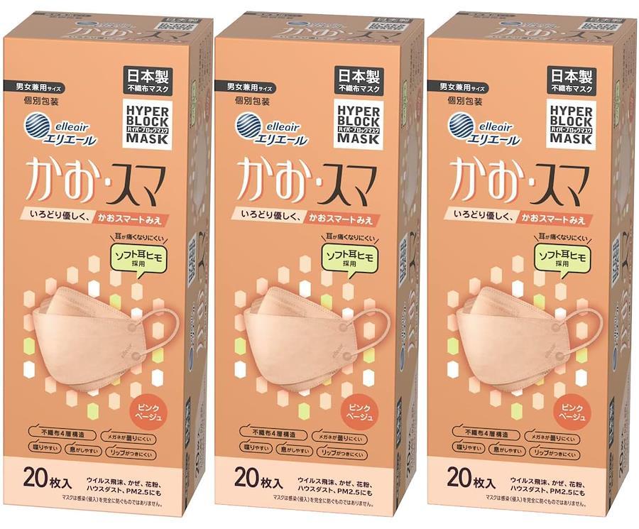 ●エリエールから日本製不織布立体型マスク「ハイパーブロックマスク かお・スマ」。 ●フェイスラインがシャープに見える「ダイヤモンド形状」 ●長時間使用でも耳が痛くなりにくい「ソフト耳ヒモ」 太くてやわらかい耳ヒモで、長時間の装着でも耳が痛くなりにくい。 ●耳ヒモまで鮮やかなカラー 耳ヒモもマスク本体と同色。ナチュラルでやさしい色合い。※マスク内側は白色。 ●さくらの花をモチーフにしたエンボスマスク 本体上部・下部には、かわいらしい「さくらの花」のエンボスを採用。