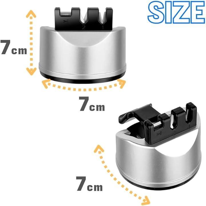「商品内容」シャープナー本体:1台、寸法: 縦 7cm 横 7cm 高さ 7cm、刃の種類:粗目砥石(炭化タングステン)、細目砥石(セラミック)、平面砥石(炭化タングステン) *本商品はセラミック包丁にはお使いいただけません。
