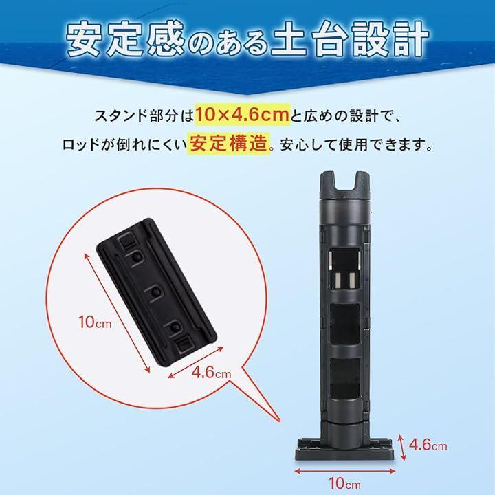 「安定感のある土台設計」スタンド部分は10x4.6cmと広めの設計で、ロッドが倒れにくい安定構造。