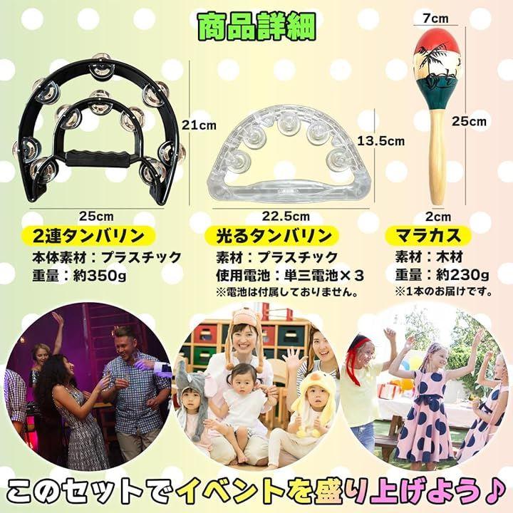 「セット内容」2連タンバリンx1、マラカスx1、光るタンバリンx1「商品詳細」<2連タンバリン>サイズ:約21cmx25cm、重量:約350g、プラスチック素材<光るタンバリン>サイズ:約22.5cmx13.5cm、プラスチック素材<マラカス>サイズ:約25cm、重量:230g、素材:木材*対象年齢6歳以上