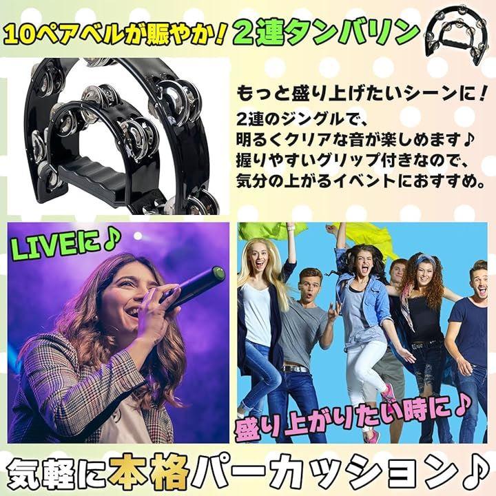 「迫力のある2連ハンドタンバリン」 2列構造のハンドタンバリンは、ジングルが明るく澄んだ音を生み出します。