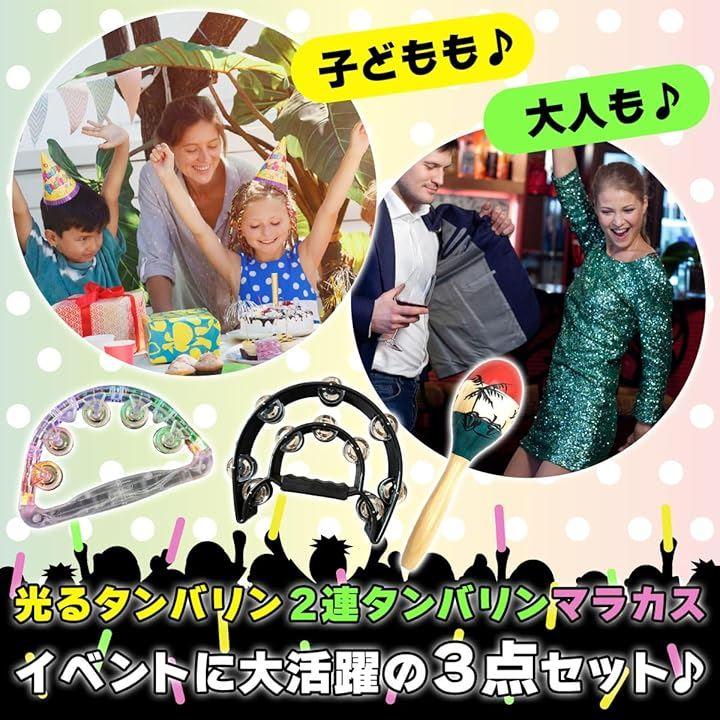 「音と光で盛り上がる。3点パーカッションセット」 光るタンバリン、木製マラカス、2連ハンドタンバリンの豪華3点セットです。