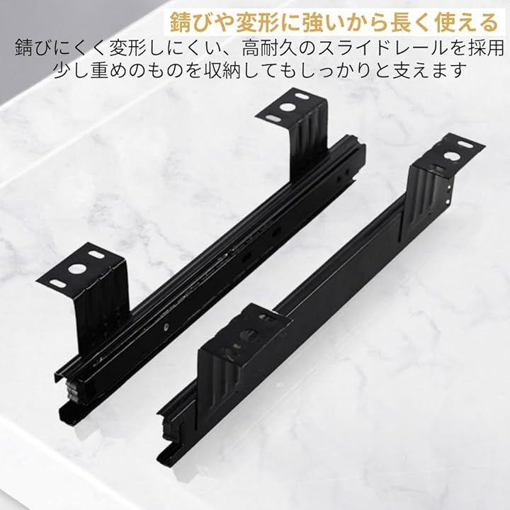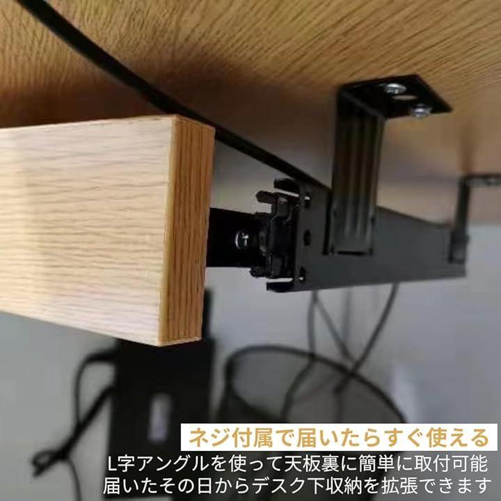 「ネジ付属で届いたらすぐ使える」取り付けに必要なネジが付属。L字アングルを使って天板裏側に簡単に取り付けられるスライドレール。