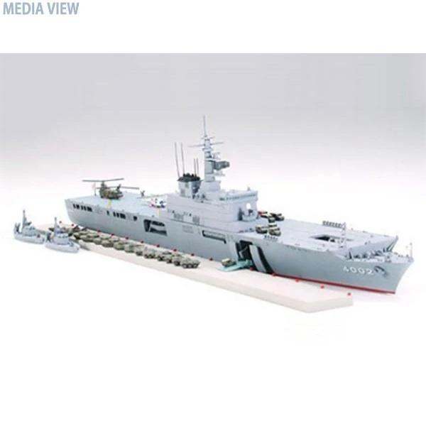 タミヤ 1/700 ウォーターラインシリーズ No.006 海上自衛隊輸送艦 LST-4002 しもきた プラモデル 31006 海上自衛隊の最新鋭輸送艦 「しもきた」 の1/700プラスチック組立てキットです。全長254mm、全幅37mm。ステルス船体の外観はもちろん、ウェルドック内部、前部の中央格納部、車輛搬入時に使用する左右の舷側ハッチ、第一昇降機、中央格納庫とウェルドックをつなぐ中央歩板と呼ばれるゲートまで新金型で立体化、後部の大型ランプは可動。飛行甲板や車輛甲板は透明で成型され完成後も内部を見ることができます。航行状態と格納状態各2隻のエアクッション艇LCACとCH-47Jヘリコプター2機に加え、SH-60J哨戒ヘリコプター2機を新たに追加。海上自衛隊最速の艦艇であるミサイル艇1号型を2隻セット。陸上自衛隊の中でも最新鋭の車輛を中心に、小型の車輛から大型のトラック、戦車、装甲車、砲車にいたるまでリアルに立体化。埠頭 (250mm×20mm)と接岸時に使用するクッションを再現。デカールはおおすみ型2番艦の「4002」、艦載車輛マーキングと共に新規デザイン。