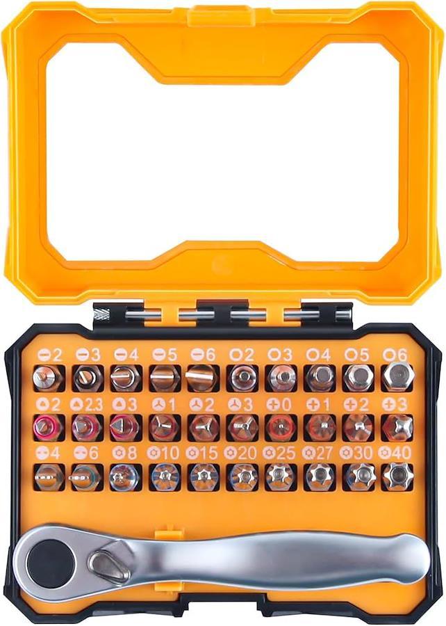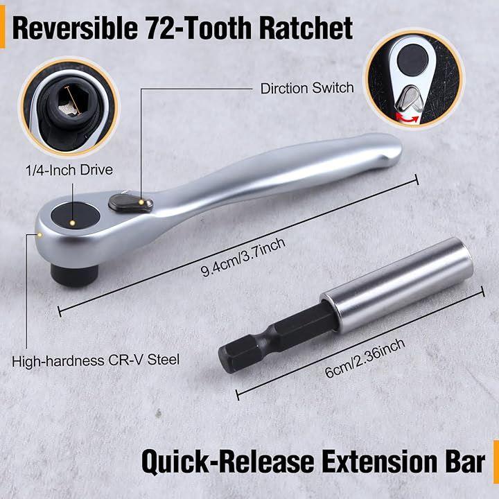 パッケージに含まれるもの:7種類(SL、PH、六角、三角形、U字型、Y型、トルクス)の30個のドライバービット、1個の1/4インチミニラッチレンチ、および1個の延長ビットホルダー—さまざまな形状のネジを取り外すように設計されています。
