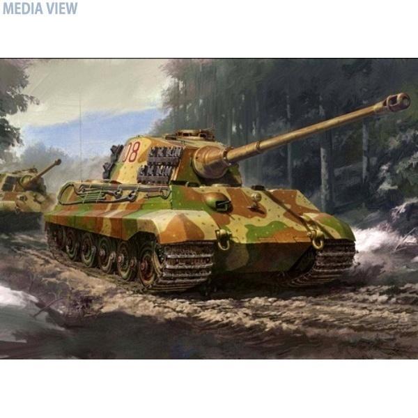 全長=211 mm。写真はキットを組み立て、塗装したものです。【 ドイツ最強戦車の風格も伝わる 】 第二次大戦後期の1944年に登場したドイツ最強の重戦車がキングタイガーです。車体前面150mm、側面80mmという分厚い装甲に加え、あらゆる連合軍戦車を遠距離から撃破できる強力な71口径88mm砲を搭載。最初の試作50輌がポルシェ社設計の砲塔を載せていたのに対し、量産型はヘンシェル社設計の改良型砲塔を備えていました。ドイツ軍が形勢逆転を狙った1944年12月のアルデンヌの戦いに集中的に投入されるなど大戦終結の日まで奮戦。連合軍にとって最大の脅威となったのです。【 模型要目 】 ドイツの重戦車キングタイガーの1/48スケール、プラスチックモデル組み立てキットです。 全長211mm、ヘンシェル砲塔を備える量産型の姿を高い実感で再現。ローダーズハッチは開閉選択式、その他の乗員用ハッチは可動式。 シャーシはダイキャスト製として重量感を演出。 キャタピラは組立てやすさも考慮して直線部分を一体とした連結式。 デカール3種類付き。