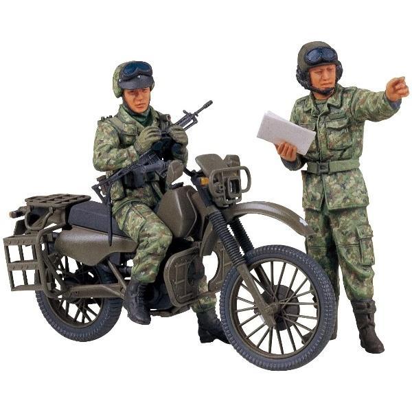 タミヤ 1/35 ミリタリーミニチュアシリーズ No.245 陸上自衛隊 オートバイ偵察セット プラモデル 35245 陸上自衛隊偵察部隊のオートバイ、そして偵察部隊員と戦車乗員の人形各1体のセットです。オートバイはエンジン周りやスポーク、ライトガードなど立体感豊かにモデル化。そして偵察部隊員は双眼鏡を手に乗車中のポーズで、89式小銃や銃剣、懐中電灯、85式携帯無線機などの装備品もシャープな仕上がりです。また戦車乗員は地図を片手に進路を指し示す姿で再現、打合わせ中の情景シーンなどを手軽に楽しんでいただけます。