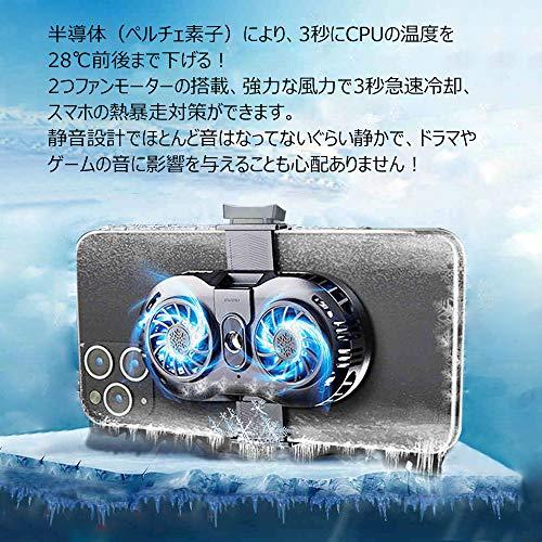 ?「 過熱防止・急速冷却 」スマートフォンで自撮り写真や生放送、動画撮影、SNS、You Tube、Facebook、TikTokやFPS系のゲームをするので熱暴走対策用の冷却ファンです。 [2020年最新設計:冷却ファンの裏面は最高級の半導体冷却技術(氷陶磁冷感シート)を搭載した、アルミより熱伝導が良いので効率的に熱を吸い取り、ヒートシンクの表面積を広げる事で、自然放熱で吸い取った熱を冷却します。 強烈な熱を持つす携帯電話のCPUなどは、冷却クーラーに氷陶磁冷感シートを付ける事で、さらに急速の冷却効果を実現しています。]?「 超静音・長時間動作対応 」超低騒音設計、生放送時にクリアに音声入力ができます。通話中でも、生放送中或いはWeb会議でも、2つ騒音低減扇風機により冷却クーラーからのノイズの影響は受けにくく、クリアで綺麗な高音質通話・録音体験を楽しめます。 生放送やゲーム等などを長時間していると、スマホ裏面に本製品を装着、発熱による急に画面が暗くなることや連続異常の問題は解決されます。(ご注意:マホ散熱器長時間動作ので、機械本体が軽微な熱くなります。 これは正常な現象、スマホの冷却効果には影響を与えないです。)?「 生放送のために生まれる・USB給電式 」ボールジョイント付属、自撮リスタントやスマホ三脚スタントに付ける事で、屋内・屋外の自撮り写真や生放送、動画撮影、ゲームなど時に、スマホの熱を逃がし、スマホの発熱を抑えます。 主流のUSB充電ポートとUSB Type-c充電ポートを採用しています。 スマホ冷却クーラーはポータブル充電器で充電でき、スマートフォンは冷却クーラーのUSBポートを通じて冷却クーラーから充電できます。 同時に2通りの充電が行えるので、長時間撮影も安定して行えます。(ご注意:本製品はバッテリー内蔵していません。電源入りは必要です。)?「 安定なクリップ・機種対応 」背面クリップは滑り止めマット付き、しっかりスマホに固定されて、携帯電話を傷つけることはありません。 幅4~6.5インチのiPhone / Androidスマートフォン用のすべてのモデルに適用可能発熱を気にせずにさまざまなゲームをプレイできます。 iPhone/Huawei/Sony/Samsung等々機種に対応です。?「 1年品質保証 」本製品は1年保証付きです。 ご使用中に万が一不具合などが発生した場合、無償で修理または新品交換を保証いたします。 お客様に安心してお使いいただけるように、品質だけでなくサポート体制も重視しております。 責任を持って全力で対応させていただきますので、まず当方までご連絡お願い致します。 それでも具合の悪いときは必ず [注文履歴] - [出品者に連絡する] にご相談ください。 日本語スタッフによる迅速な対応をお約束いたします。 ただし、お客様ご自分の使用による破損、改造や故障に関しましては対象外となります。