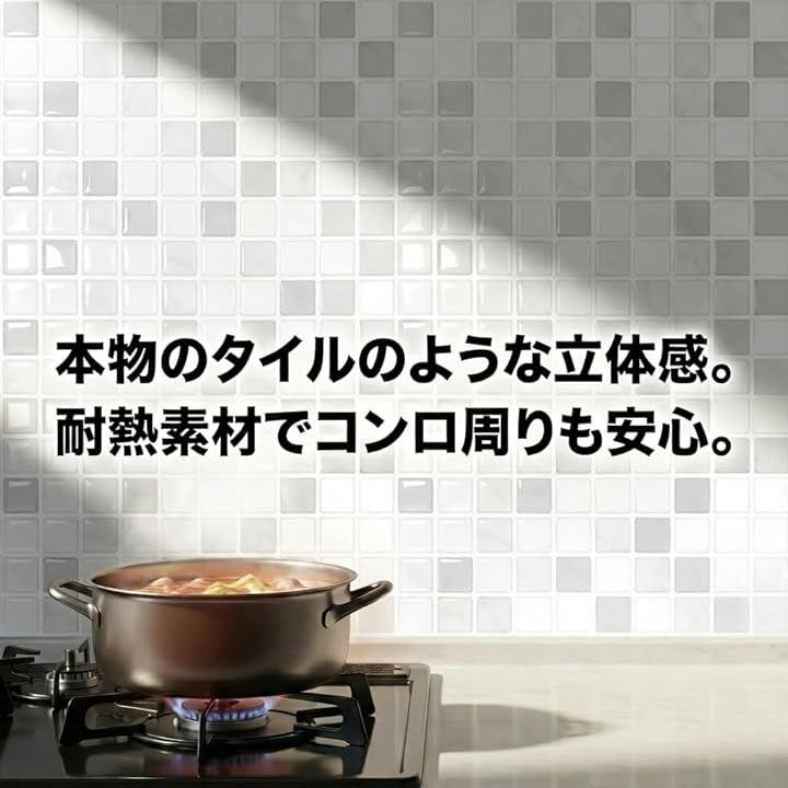 「キッチンの壁の汚れが気になる…」「賃貸だから本格的な工事はできない…」そんな悩みも、アチスメルの3Dタイルシールなら解決できます。