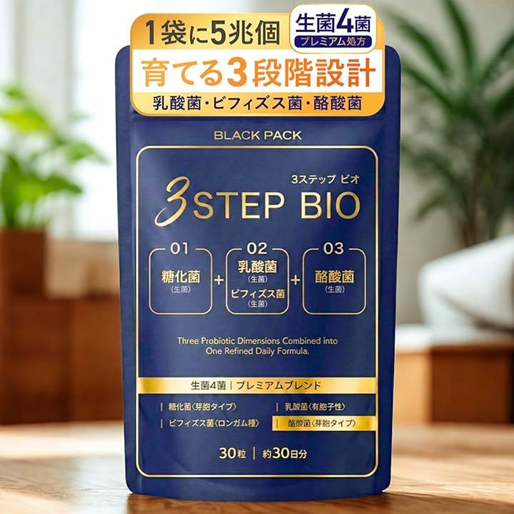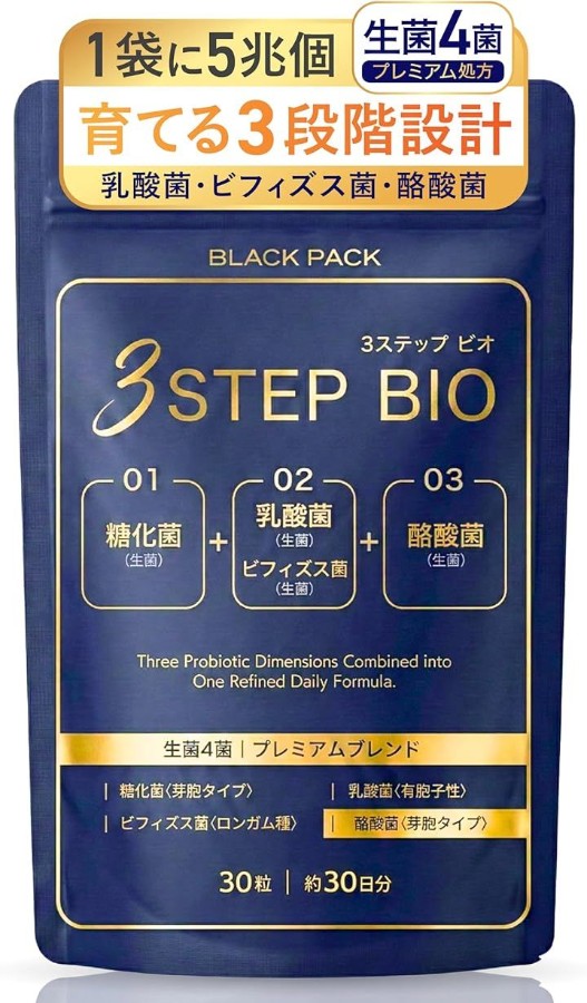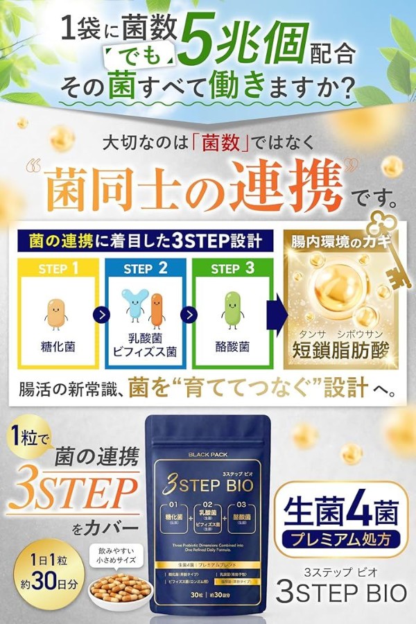 「「菌同士の連携に着目」した3STEP(ステップ)設計」腸内環境のカギである「短鎖脂肪酸(タンサ シボウサン)」作りに必要な、生菌4種を贅沢処方。