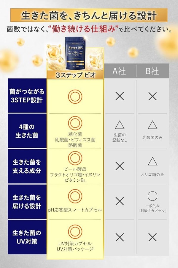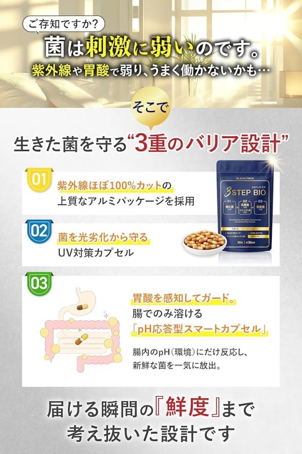 /(1)紫外線ほぼ100%カットの上質なアルミパッケージ/(2)菌を光劣化から守るUVカットカプセル/(3)胃酸を感知して中身をガード。