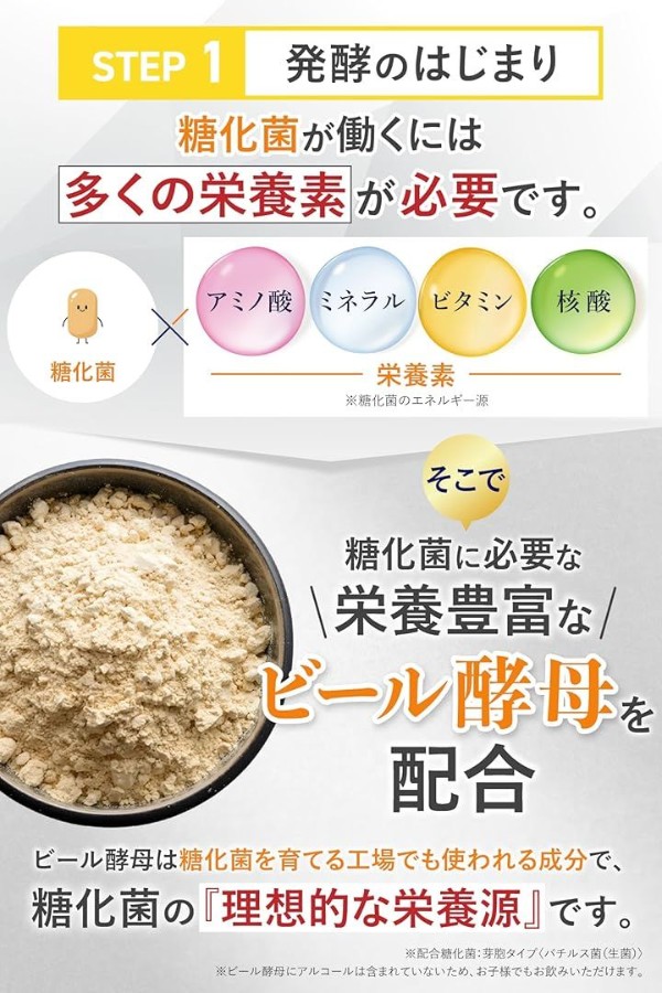 「STEP1 発酵のはじまり」生きた糖化菌が働くために、必要な栄養をたっぷり含んだ「ビール酵母」を配合。