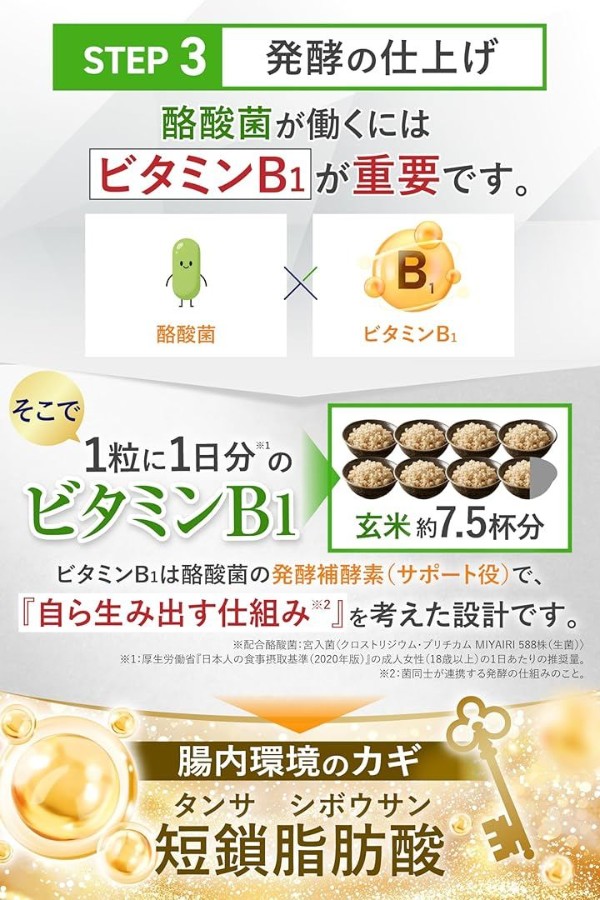 ビタミンB1は酪酸菌の発酵補酵素(サポート役)で、「自ら生み出す仕組み」を考えた設計です。