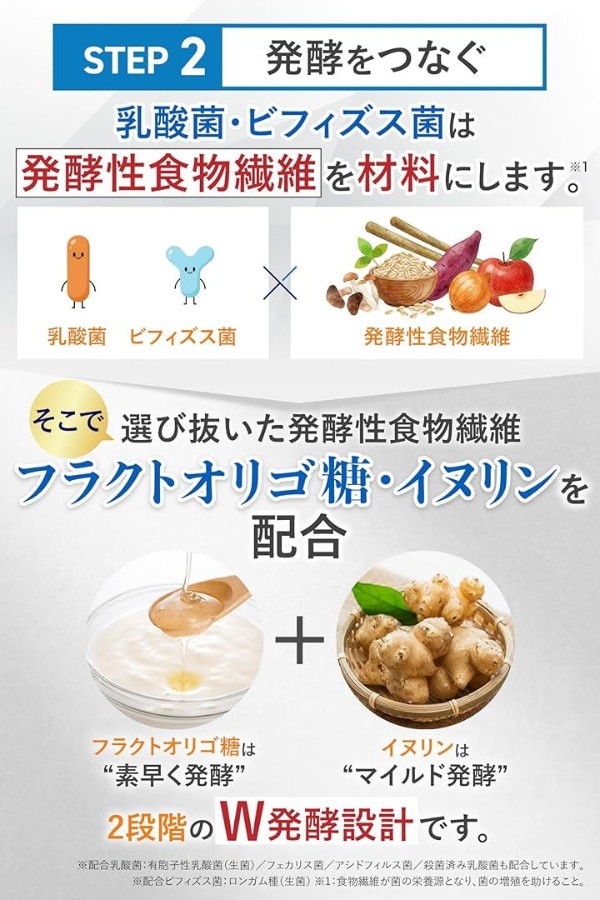 そこで、発酵性食物繊維である「フラクトオリゴ糖」と「イヌリン」を配合。