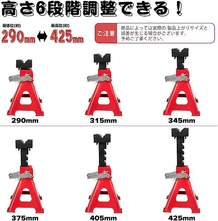 ・「二重ロック設計」このジャッキは6段階の高さ調整が可能で、有効利用可能な高さは290~425mmです。