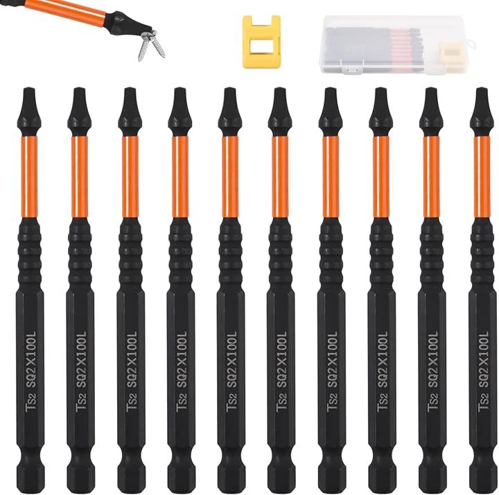 「セット内容」4インチ角ビット10本、35mm磁気ビット(黄色)x1、収納ケースx1(付属)で保管・携帯に便利。