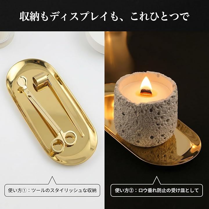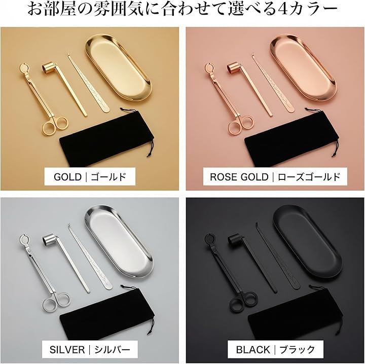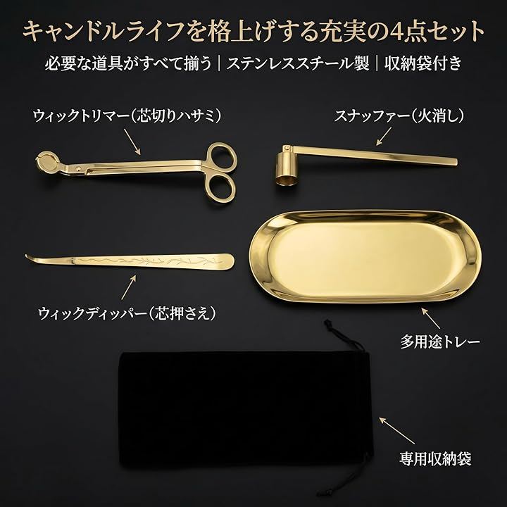 芯切りハサミ(ウィックトリマー)・火消し(スナッファー)・芯押さえ(ウィックディッパー)・多用途トレーで、初心者から愛好家まで本格的なキャンドルライフを実現できます。