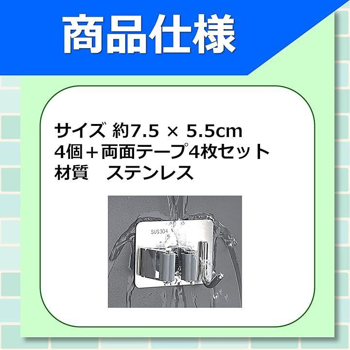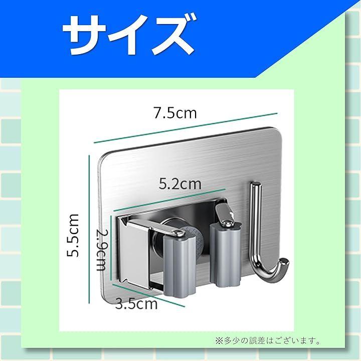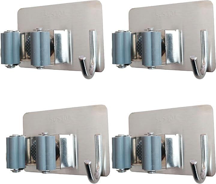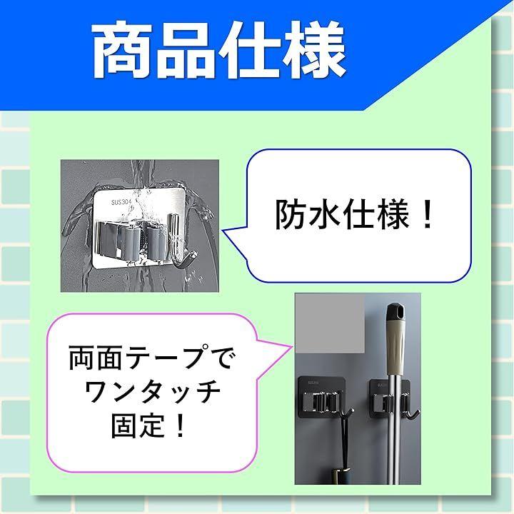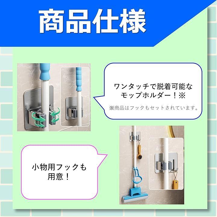 「穴あけ不要で簡単取り付け。モップホルダー4点セット」 壁を傷つけずに簡単に取り付けられる「モップホルダー4点セット」で、収納をスマートに。モップやほうき、ワイパーをしっかり固定し、散らかった掃除道具をスッキリ収納。