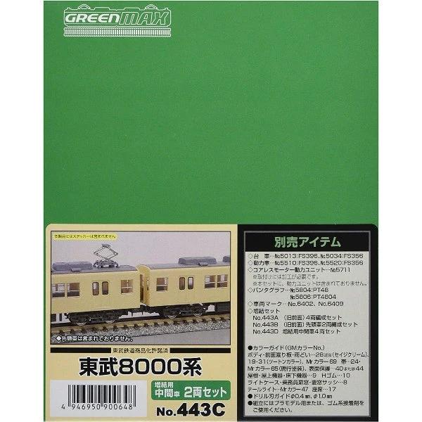 グリーンマックス Nゲージ 東武8000系 増結用中間車2両セット 443C 鉄道模型 電車 セイジクリーム時代の再現に最適です (セットの中間車は中間車貫通扉増設前の形態です)。ボディは一体成型 (未塗装)、前面ガラスと側面ガラスは黒色Hゴムと銀色サッシの印刷が入ります。未修繕時代を再現するには、側面方向幕の彫刻を撤去する加工が必要となります。屋根にベンチレーターを取り付ける際には、φ=1.0mmのドリル刃で開口する必要があります。別売の車両マーク (下記オプションパーツ欄参考)でお好みの車両番号に設定できます。コアレスモーター動力ユニット用の動力台車枠2種類 (FS396/FS356)と床下機器が付属します。台車・動力ユニット・パンタグラフなどは付属しませんので、別売アイテムをご使用ください。ステッカー、車両マークは付属しません。※模型化にあたり一部実車と異なる箇所がございます。予めご了承ください。