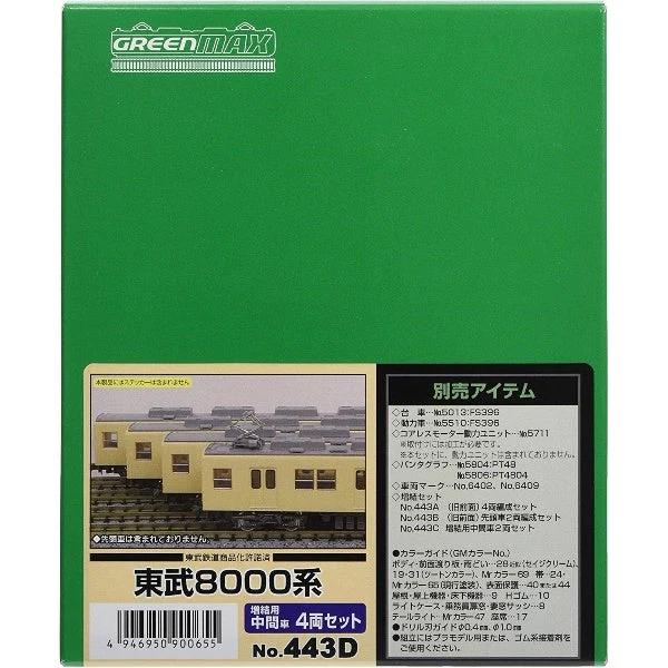 グリーンマックス Nゲージ 東武8000系 増結用中間車4両セット 443D 鉄道模型 電車 セイジクリーム時代の再現に最適です (セットの中間車は中間車貫通扉増設前の形態です)。ボディは一体成型 (未塗装)、前面ガラスと側面ガラスは黒色Hゴムと銀色サッシの印刷が入ります。未修繕時代を再現するには、側面方向幕の彫刻を撤去する加工が必要となります。屋根にベンチレーターを取り付ける際には、φ=1.0mmのドリル刃で開口する必要があります。別売の車両マーク (下記オプションパーツ欄参考)でお好みの車両番号に設定できます。コアレスモーター動力ユニット用の動力台車枠2種類 (FS396/FS356)と床下機器が付属します。台車・動力ユニット・パンタグラフなどは付属しませんので、別売アイテムをご使用ください。ステッカー、車両マークは付属しません。※模型化にあたり一部実車と異なる箇所がございます。予めご了承ください。