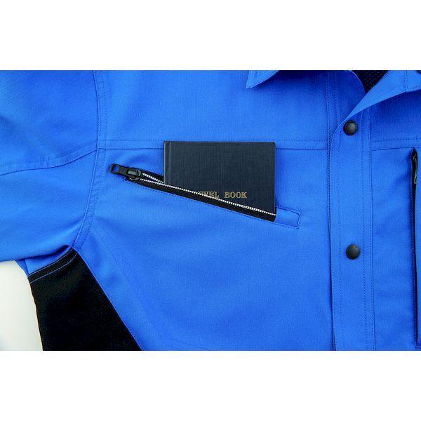 ●ストレッチ素材 左胸ファスナーポケット 右胸ファスナーポケット 左腕ペン差し 袖口Wドットボタン 背当てメッシュ 脇スリット