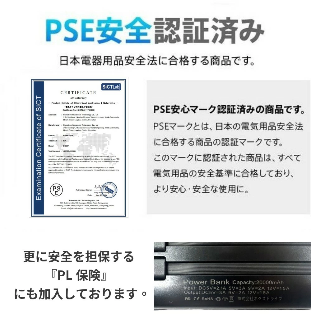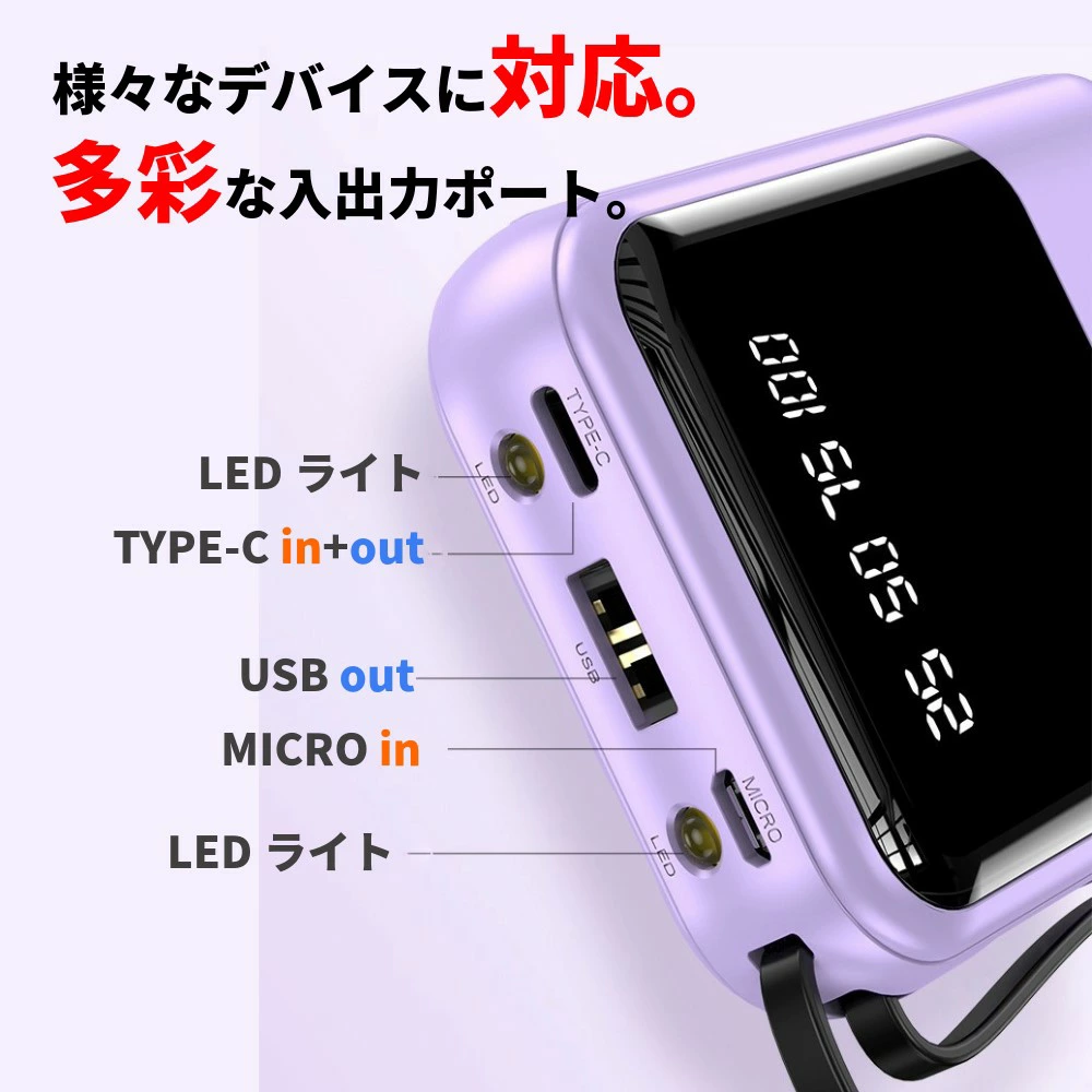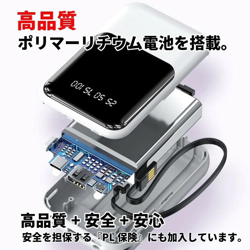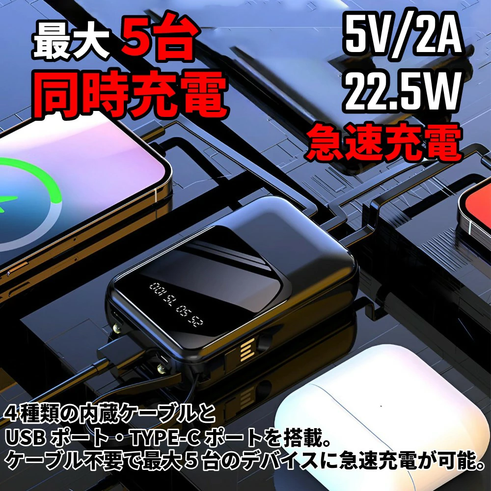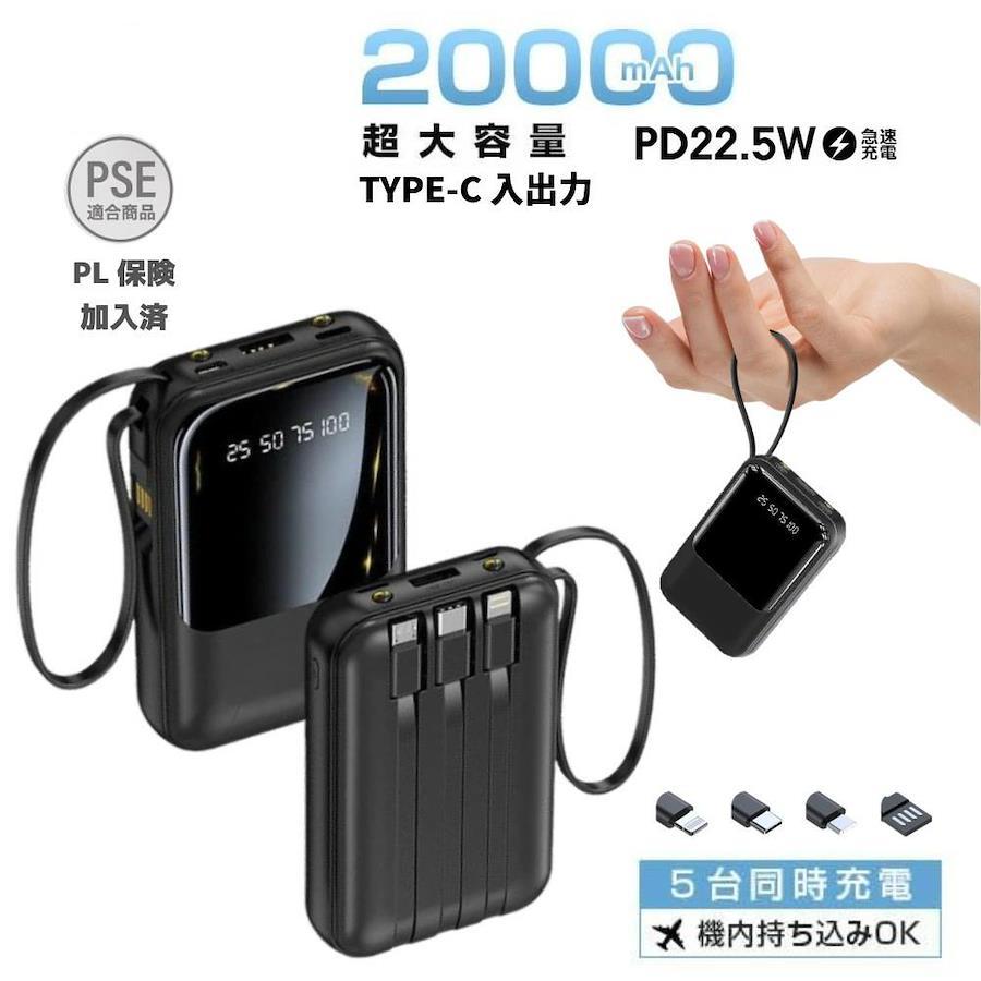 高品質 軽量 小型 20000mAh 大容量 急速充電 内蔵ケーブル 5台同時充電 モバイルバッテリー PSE基準適合品 です。