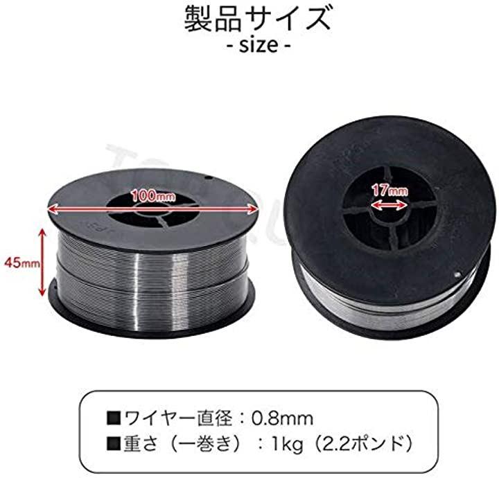 「半自動溶接機用」MIG ノンガスワイヤー(フラックスワイヤー)ガス不要 MIG100,MIG130,MIG160,MIG200 スズキッド アーキュリー 「商品仕様」本体サイズ:取付部内径16mm、外形100mm、高さ47mm、ワイヤー直径:0.8mm、重量:1kg/2.2ポンド(1巻)x5個、オリジナルマイクロファイバータオルx1