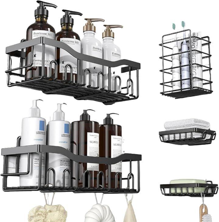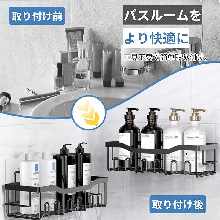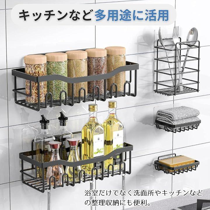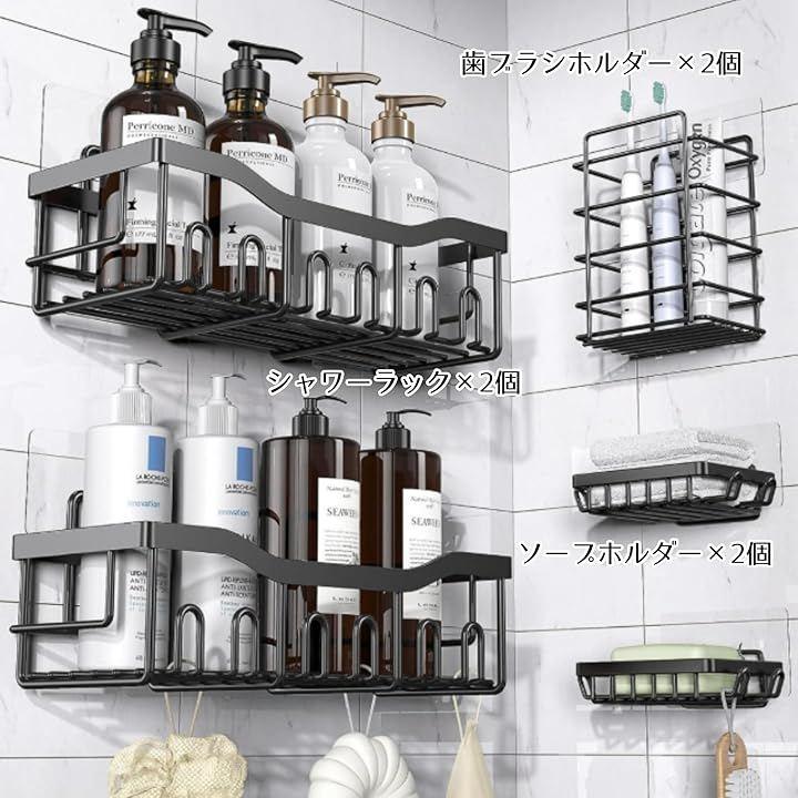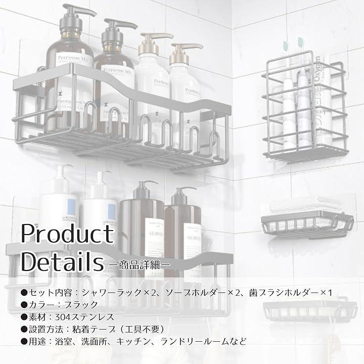 「商品詳細」 セット内容:シャワーラックx2、ソープホルダーx2、歯ブラシホルダーx1 カラー:ブラック 素材:304ステンレス 設置方法:粘着テープ(工具不要) 用途:浴室、洗面所、キッチン、ランドリールームなど