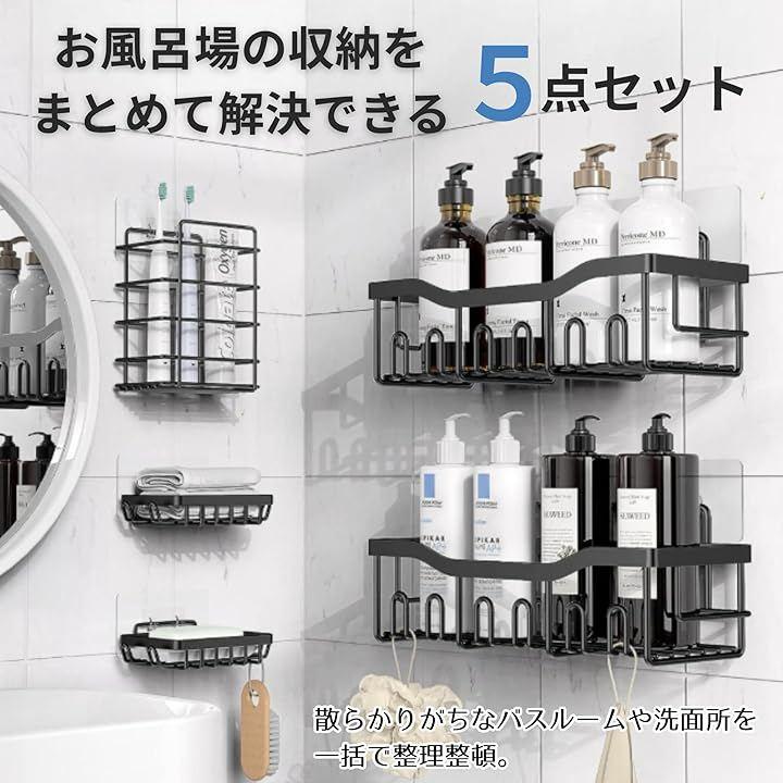 「お風呂場の収納をまとめて解決する5点セット」 シャワーラック2個、ソープホルダー2個、歯ブラシホルダー1個の5点セットで、散らかりがちなバスルームや洗面所を一括で整理整頓。