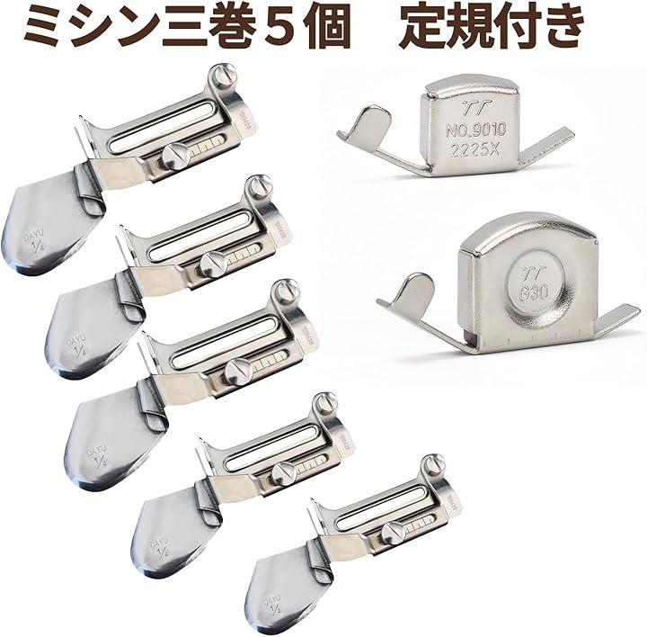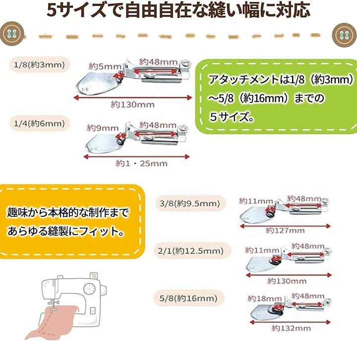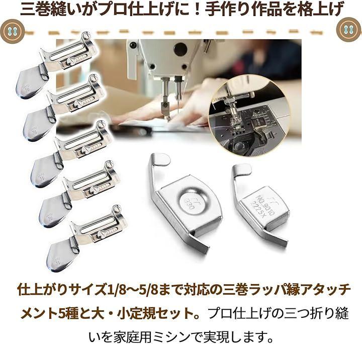 仕上がりサイズ1/8~5/8まで対応の三巻ラッパ縁アタッチメント5種と大・小定規セット。