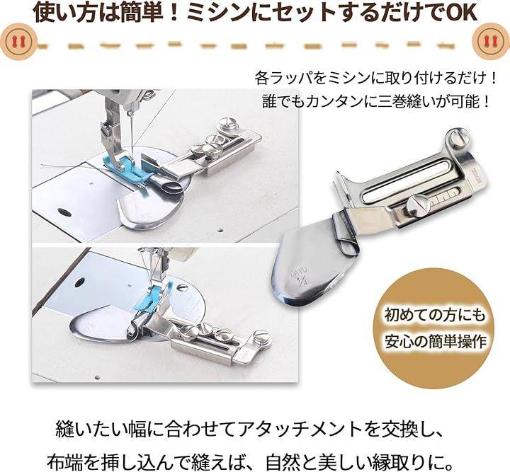 各ラッパをミシンに取り付けるだけで、誰でも簡単に三巻縫いが可能。