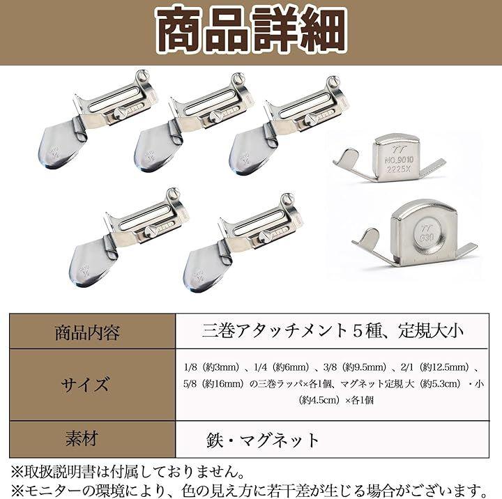 「商品内容」三巻アタッチメント5種、定規大小 「サイズ」1/8(約3mm)、1/4(約6mm)、3/8(約9.5mm)、2/1(約12.5mm)、5/8(約16mm)の三巻ラッパx各1個、マグネット定規 大(約5.3cm)・小(約4.5cm)x各1個「素材」鉄・マグネット *モニターの環境により、色の見え方に若干差が生じる場合がございます。